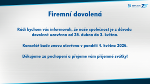 Všechny zprávy, All News Firemní dovolená 23. 04. 2026 Rádi bychom vás informovali, že naše společnost je z důvodu dovolené uzavřena od 25. dubna do 3. května. Kancelář bude znovu otevřena v pondělí 4. května 2026. Děkujeme za pochopení a přejeme vám příjemné svátky!
