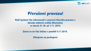 Všechny zprávy, All News Přerušení provozu! 28. 10. 2019 Rádi bychom Vás informovali o uzavření hlavního provozu z důvodu státních svátků (Slovinsko) ve dnech 31.10. až 1.11. 2019. Znovu se na Vás těšíme v pondělí 4.11.2019. Děkujeme za pochopení.