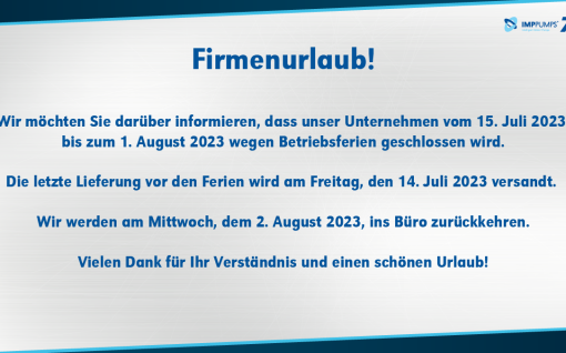 IMP PUMPS ist vom 15. Juli bis zum 1. August 2023 aufgrund unserer…