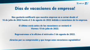 Nos gustaría notificarle que nuestra empresa va a cerrar desde el 16 de julio de 2022 hasta el 2 de agosto de 2022 debido a vacaciones de la empresa.