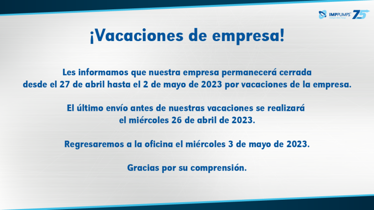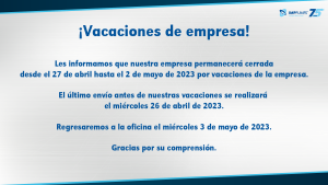 Les informamos que nuestra empresa permanecerá cerrada desde el 27 de abril hasta el 2 de mayo de 2023 por vacaciones de la empresa.