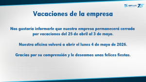 Todas las noticias Vacaciones de la empresa 23. 04. 2026 Nos gustaría informarle que nuestra empresa permanecerá cerrada por vacaciones del 25 de abril al 3 de mayo. Nuestra oficina volverá a abrir el lunes 4 de mayo de 2026. Gracias por su comprensión y le deseamos unas felices fiestas.