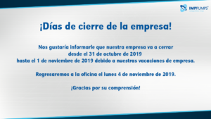 Todas las noticias ¡Vacaciones públicas! 28. 10. 2019 Nos gustaría informarle que nuestra empresa cerrará desde el 31 de octubre de 2019 hasta el 1 de noviembre de 2019 debido a nuestras vacaciones corporativas. Regresaremos a la oficina el lunes 4 de noviembre de 2019. ¡Gracias por su comprensión!