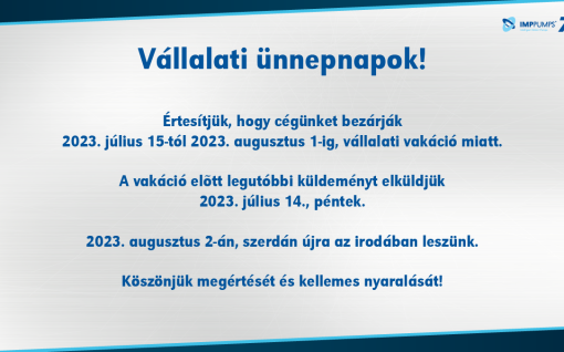 Az IMP PUMPS 2023. július 15-től augusztus 1-ig zárva tart a vállalati szabadság…