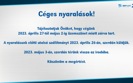 Tájékoztatjuk Önöket, hogy cégünk 2023. április 27-től május 2-ig üzemszünet miatt zárva tart….