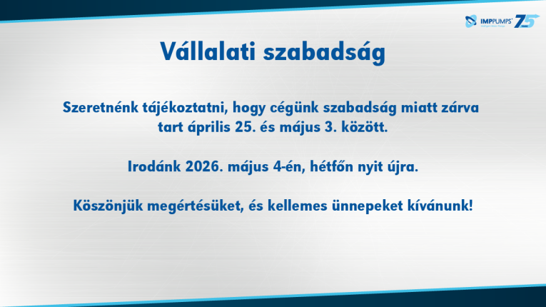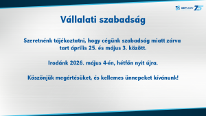 All News Vállalati szabadság 23. 04. 2026 Szeretnénk tájékoztatni, hogy cégünk szabadság miatt zárva tart április 25. és május 3. között. Irodánk 2026. május 4-én, hétfőn nyit újra. Köszönjük megértésüket, és kellemes ünnepeket kívánunk!