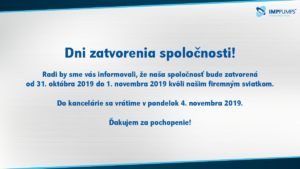 Všetky správy Dni zatvorenia spoločnosti! 28. 10. 2019 Radi by sme vás informovali, že naša spoločnosť bude zatvorená od 31. októbra 2019 do 1. novembra 2019 kvôli našim firemným sviatkom. Do kancelárie sa vrátime v pondelok 4. novembra 2019. Ďakujem za pochopenie!