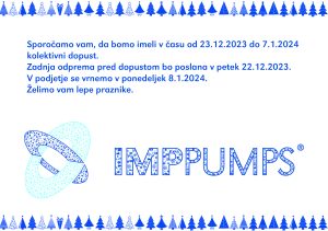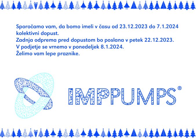 Vse novice Božični prazniki 2023 28. 11. 2023 Sporočamo vam, da bomo imeli v času od 23.12.2023 do 7.1.2024 kolektivni dopust. Zadnja odprema pred dopustom bo poslana v petek 22.12.2023. V podjetje se vrnemo v ponedeljek 8.1.2024. Želimo vam lepe praznike.