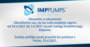 Vse novice Kolektivni dopust 21. 04. 2021 Obvestilo o odsotnosti: Obveščamo vas, da bo naše podjetje zaradi kolektivnega dopusta zaprto od 24.4.2021 do 2.5.2021. Zadnja pošiljka pred prazniki bo poslana v Petek, 23.4.2021.