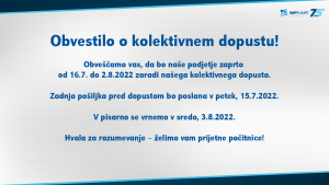 Obveščamo vas, da bo naše podjetje zaprto od 16.7. do 2.8.2022 zaradi našega kolektivnega dopusta.