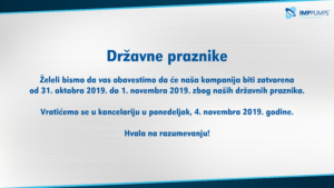 Sve vesti Državni praznik 28. 10. 2019 Želeli bismo da vas obavestimo da će naša kompanija biti zatvorena od 31. oktobra 2019. do 1. novembra 2019. zbog naših državnih praznika. Vratićemo se u kancelariju u ponedeljak, 4. novembra 2019. godine. Hvala na razumevanju!