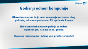 Sve vesti Godišnji odmor kompanije 23. 04. 2026 Obaveštavamo vas da je naša kompanija zatvorena zbog godišnjeg odmora u periodu od 25. aprila do 3. maja. Naša kancelarija ponovo počinje sa radom u ponedeljak, 4. maja 2026. godine. Hvala na razumevanju i želimo vam prijatne praznike!