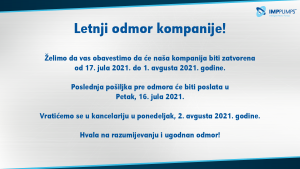 Vratićemo se u kancelariju u ponedeljak, 2. avgusta 2021. godine.