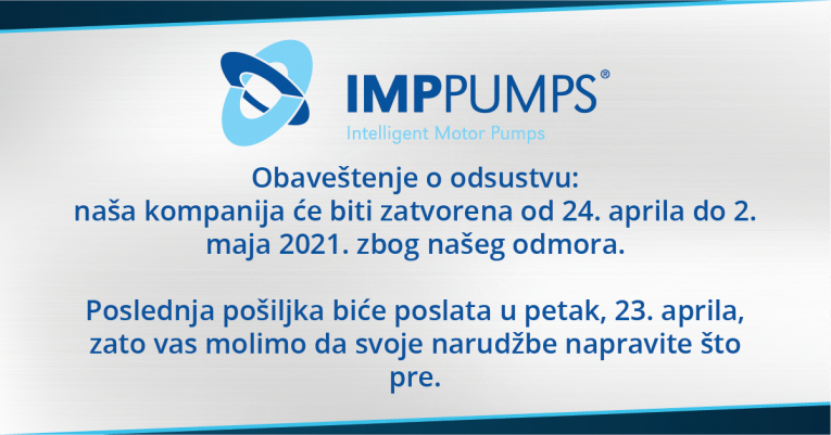 Sve vesti Odmor 21. 04. 2021 Obaveštenje o odsustvu: naša kompanija će biti zatvorena od 24. aprila do 2. maja 2021. zbog našeg odmora. Poslednja pošiljka biće poslata u petak, 23. aprila, zato vas molimo da svoje narudžbe napravite što pre.
