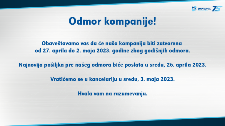 Obaveštavamo vas da će naša kompanija biti zatvorena od 27. aprila do 2. maja 2023. godine zbog godišnjeg odmora.
