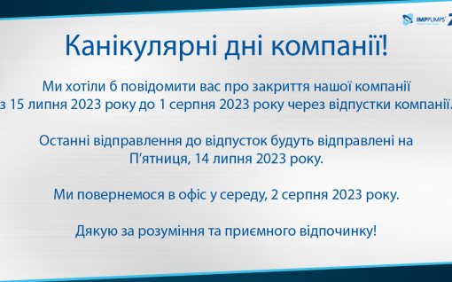 IMP PUMPS буде закрита з 15 липня по 1 серпня 2023 року у…