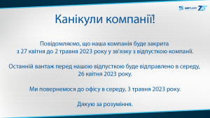 Повідомляємо, що наша компанія буде закрита з 27 квітня до 2 травня 2023 року у зв’язку з відпусткою компанії.